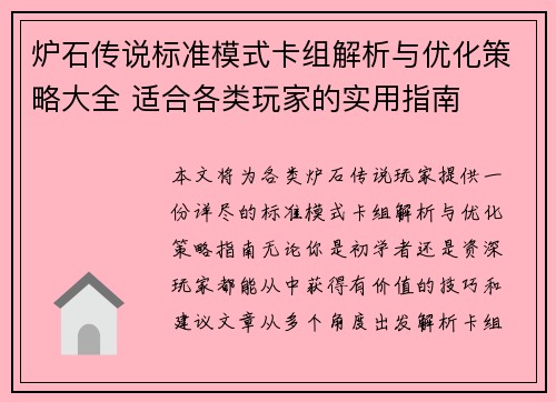 炉石传说标准模式卡组解析与优化策略大全 适合各类玩家的实用指南