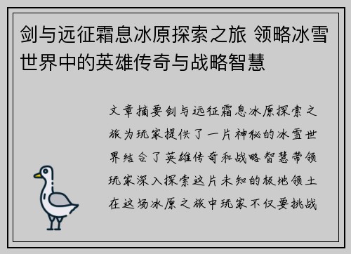 剑与远征霜息冰原探索之旅 领略冰雪世界中的英雄传奇与战略智慧